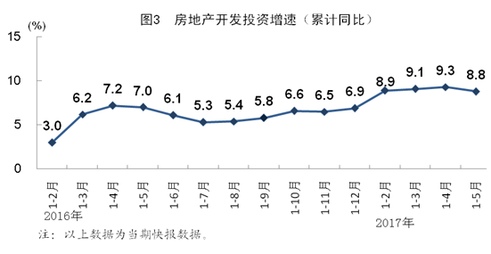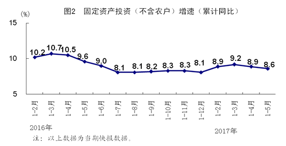 总的来看,5月份国民经济延续了稳中有进、稳中向好的发展态势,结构在改革中优化,动能在创新中成长,质量在转型中升级。但也要看到,国际国内不稳定不确定因素依然存在,结构性矛盾依然突出,转型升级任重道远。下阶段,要更加紧密地团结在以习近平同志为核心的党中央周围,坚持稳中求进工作总基调,坚持以新发展理念引领新常态,坚持以提高发展质量和效益为中心,深入推进供给侧结构性改革,适度扩大总需求,强化创新驱动,引导形成良好发展预期,统筹做好稳增长、促改革、调结构、惠民生、防风险各项工作,促进经济持续健康发展和社会和谐稳定。