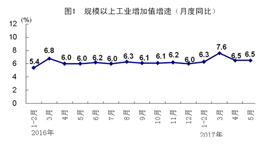5月份,全国规模以上工业增加值同比实际增长6.5%,增速与上月持平,比上年同月加快0.5个百分点。分经济类型看,国有控股企业增加值同比增长6.2%,集体企业增长3.2%,股份制企业增长6.8%,外商及港澳台商投资企业增长5.9%。分三大门类看,采矿业增加值同比增长0.5%,制造业增长6.9%,电力、热力、燃气及水生产和供应业增长6.4%。高技术产业和装备制造业增加值同比分别增长11.3%和10.3%,增速分别比规模以上工业快4.8和3.8个百分点。规模以上工业企业产销率达到97.7%。从环比看,5月份全国规模以上工业增加值比上月增长0.51%。1-5月份,全国规模以上工业增加值同比增长6.7%。5月份,制造业采购经理指数为51.2%,与上月持平,连续10个月处于荣枯线以上。