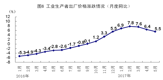 5月份,全国工业生产者出厂价格同比上涨5.5%,涨幅比上月回落0.9个百分点,环比下降0.3%。1-5月份,全国工业生产者出厂价格同比上涨6.8%。5月份,全国工业生产者购进价格同比上涨8.0%,环比下降0.3%。1-5月份,全国工业生产者购进价格同比上涨9.0%。