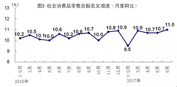 上半年,社会消费品零售总额172369亿元,同比增长10.4%,增速比一季度加快0.4个百分点,比上年同期加快0.1个百分点。其中,限额以上单位消费品零售额76953亿元,增长8.7%。按经营单位所在地分,城镇消费品零售额147786亿元,增长10.1%;乡村消费品零售额24583亿元,增长12.3%。按消费类型分,餐饮收入18546亿元,增长11.2%;商品零售153822亿元,增长10.3%,其中限额以上单位商品零售72420亿元,增长8.8%。消费升级类商品销售增长较快,文化办公用品增长11.8%,体育娱乐用品增长17.1%,家具增长13.4%,建筑及装潢材料增长13.9%。6月份,社会消费品零售总额同比增长11.0%,比上月加快0.3个百分点,环比增长0.93%。