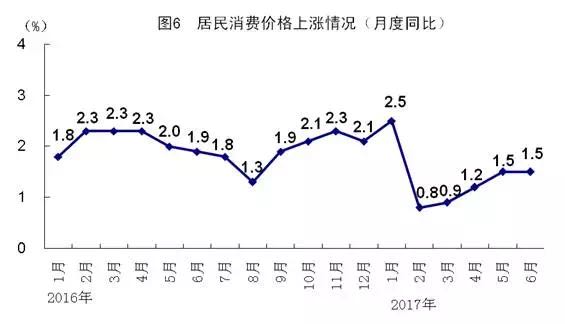 上半年,全国居民消费价格同比上涨1.4%,涨幅与一季度持平。其中,城市上涨1.5%,农村上涨1.0%。分类别看,食品烟酒价格同比下降0.8%,衣着上涨1.3%,居住上涨2.4%,生活用品及服务上涨0.8%,交通和通信上涨1.5%,教育文化和娱乐上涨2.5%,医疗保健上涨5.4%,其他用品和服务上涨3.3%。在食品烟酒价格中,粮食价格上涨1.4%,猪肉价格下降6.1%,鲜菜价格下降14.7%。6月份,全国居民消费价格同比上涨1.5%,涨幅与上月持平,环比下降0.2%。