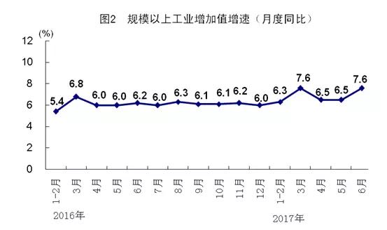 上半年,全国规模以上工业增加值同比实际增长6.9%,增速比一季度加快0.1个百分点,比上年同期加快0.9个百分点。分经济类型看,国有控股企业增加值增长6.2%,集体企业增长1.9%,股份制企业增长7.1%,外商及港澳台商投资企业增长6.7%。分三大门类看,采矿业增加值同比下降1.0%,制造业增长7.4%,电力、热力、燃气及水生产和供应业增长8.1%。制造业加快向中高端迈进,上半年高技术产业和装备制造业增加值同比分别增长13.1%和11.5%,分别比规模以上工业快6.2和4.6个百分点,占规模以上工业比重分别为12.2%和32.2%。规模以上工业企业产销率达到97.5%。6月份,规模以上工业增加值同比增长7.6%,比上月加快1.1个百分点,环比增长0.81%。