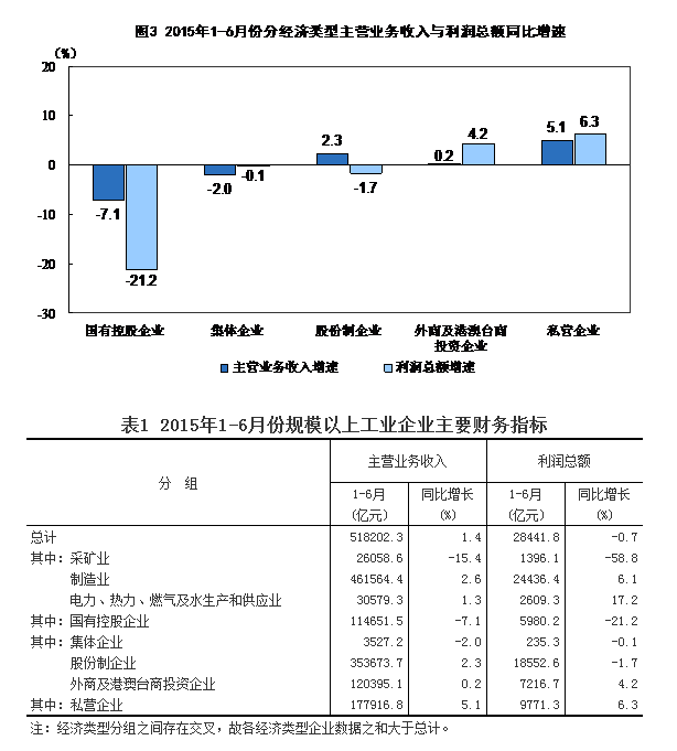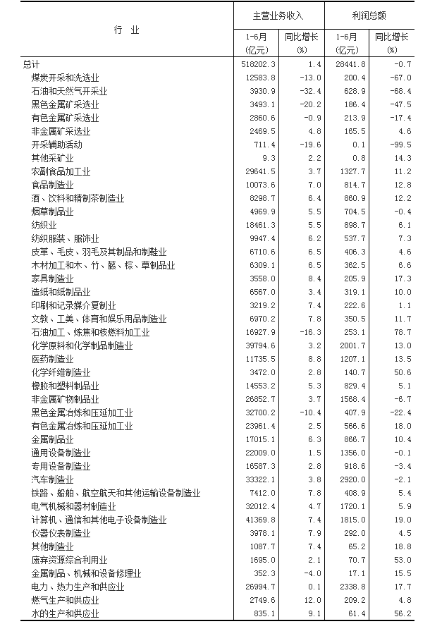 1-6月份,全国规模以上工业企业实现利润总额28441.8亿元,同比下降0.7%,降幅比1-5月份收窄0.1个百分点。